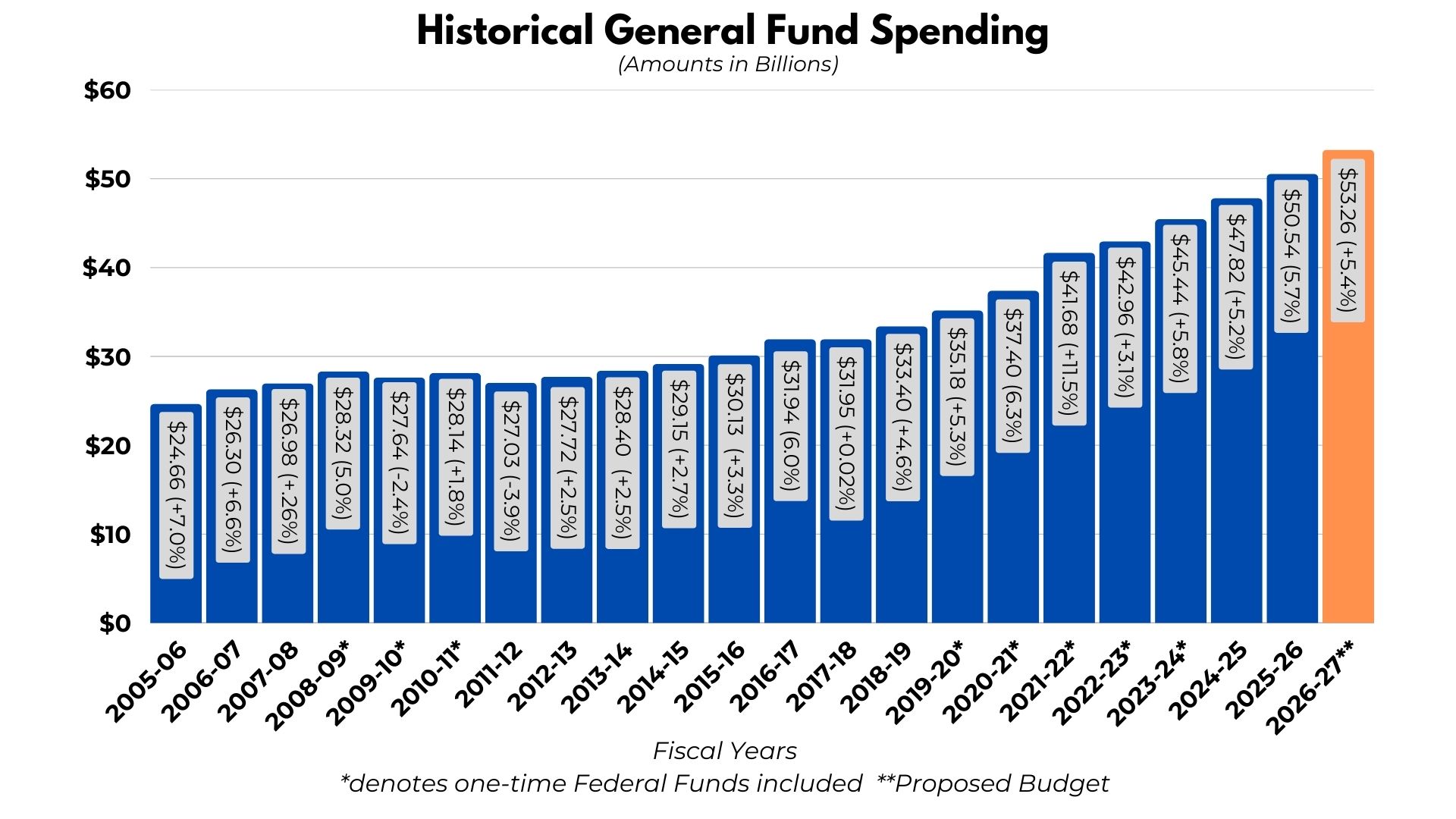 Governor's Budget Proposal for FY 2026-27 General Overview: • Governor Shapiro’s FY 2026-27 proposed budget of $53.26 billion increases spending by $2.72 billion, or 5.4%, over the current fiscal year. • FY 2026-27 current tax structure revenues are estimated to grow by $919 million, or 1.9%. • To balance his FY 2026-27 spending proposal, Governor Shapiro needs $6.46 billion in new revenue. To accomplish this, he proposed the following transfers and tax revenue modifications: o Transferring $4.58 billion out of the Rainy Day Fund to the General Fund. o Enactment of new taxes and changes to the current tax structure and tax credits totaling $1.88 billion in new revenue, primarily by taxing skill games, recreational marijuana, and a minimum wage increase. Supporting Documents Governor's Proposed Budget Overview Governor's Proposed Budget Tracking Run Governor's Proposed Budget Financial Statement Governor's Proposed Budget Agency Details Governor's Proposed School District Funding Past Spending