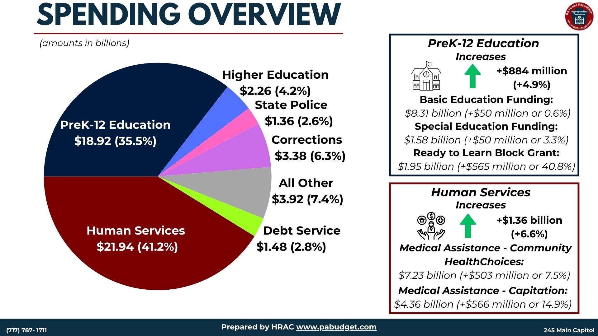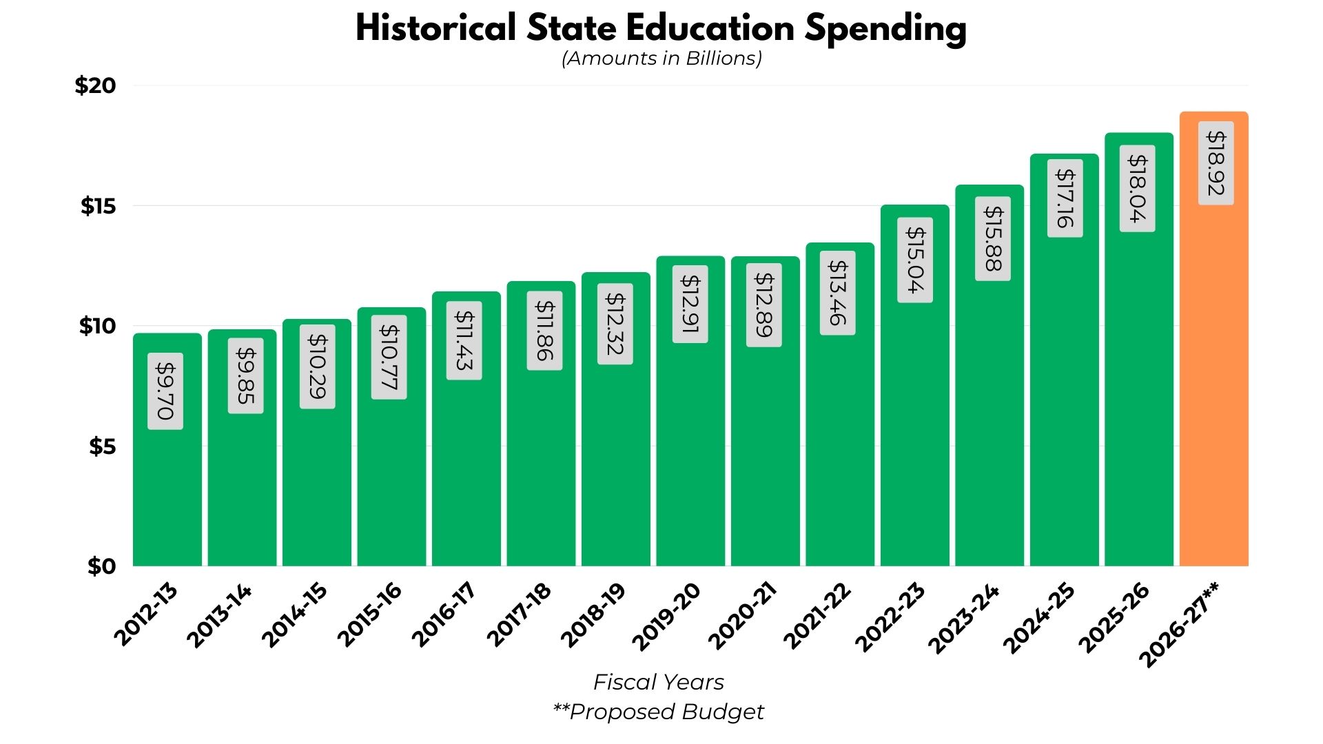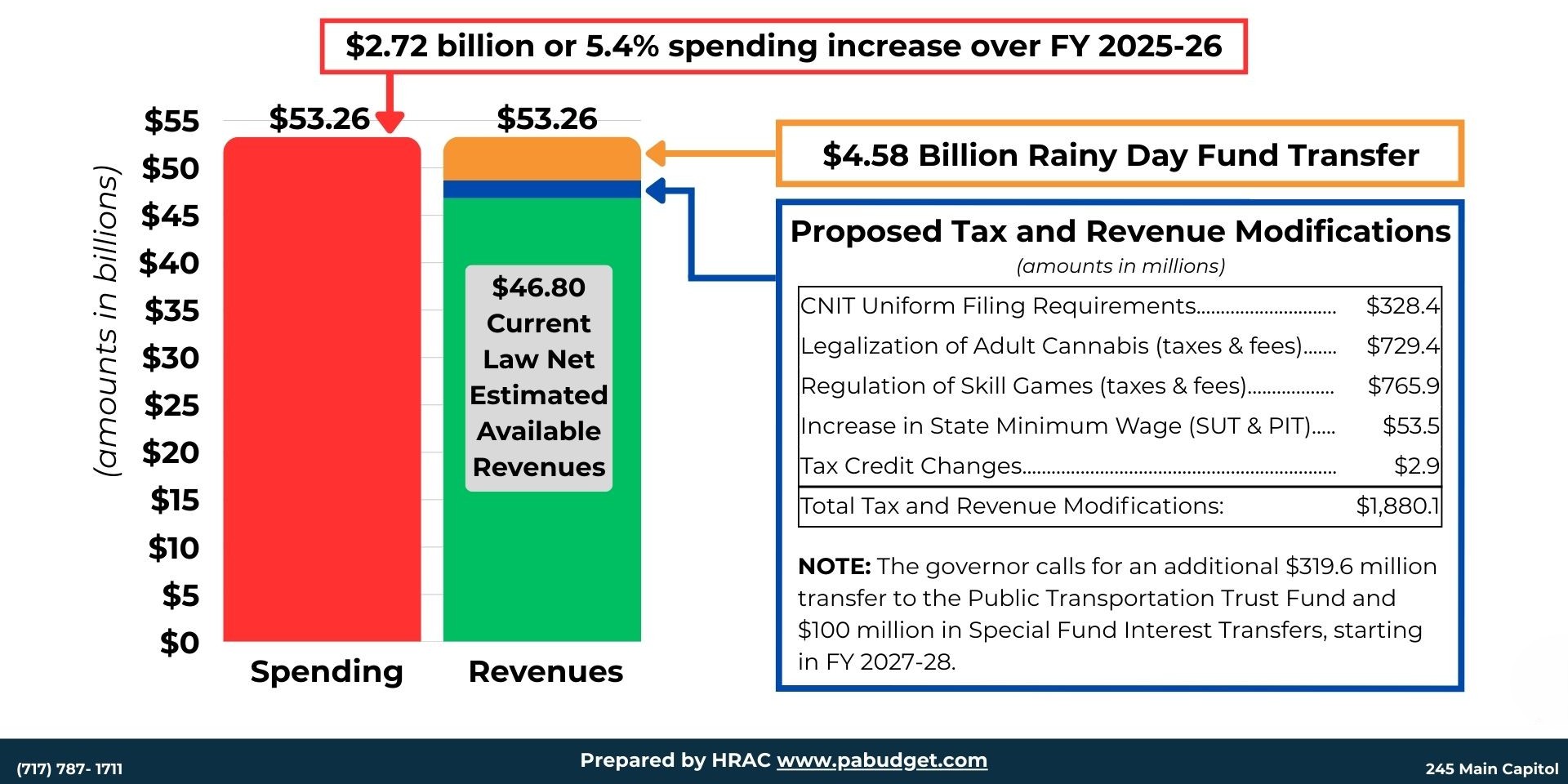 Governor's Budget Proposal for FY 2026-27 General Overview: • Governor Shapiro’s FY 2026-27 proposed budget of $53.26 billion increases spending by $2.72 billion, or 5.4%, over the current fiscal year. • FY 2026-27 current tax structure revenues are estimated to grow by $919 million, or 1.9%. • To balance his FY 2026-27 spending proposal, Governor Shapiro needs $6.46 billion in new revenue. To accomplish this, he proposed the following transfers and tax revenue modifications: o Transferring $4.58 billion out of the Rainy Day Fund to the General Fund. o Enactment of new taxes and changes to the current tax structure and tax credits totaling $1.88 billion in new revenue, primarily by taxing skill games, recreational marijuana, and a minimum wage increase. Supporting Documents Governor's Proposed Budget Overview Governor's Proposed Budget Tracking Run Governor's Proposed Budget Financial Statement Governor's Proposed Budget Agency Details Governor's Proposed School District Funding Past Spending